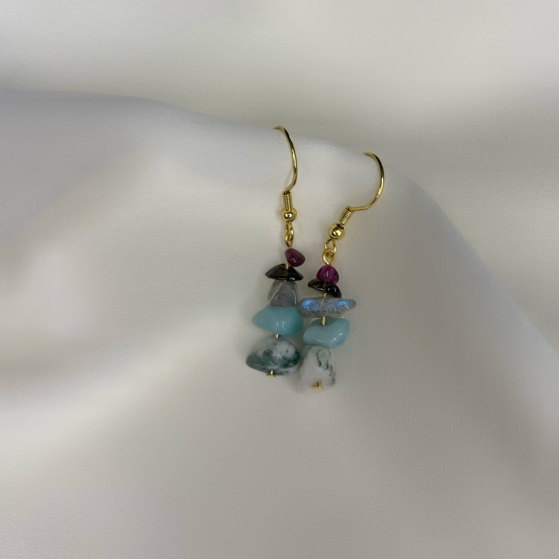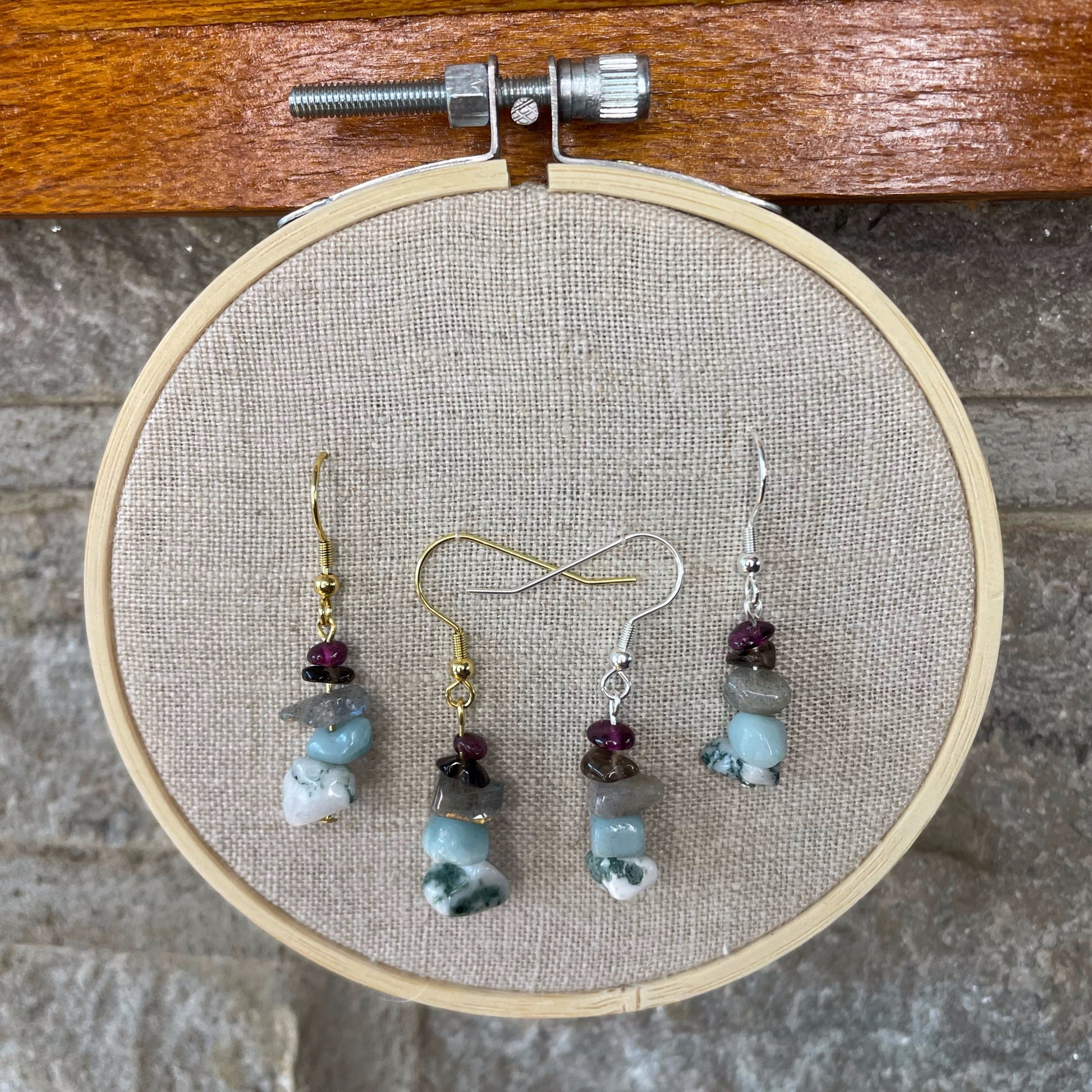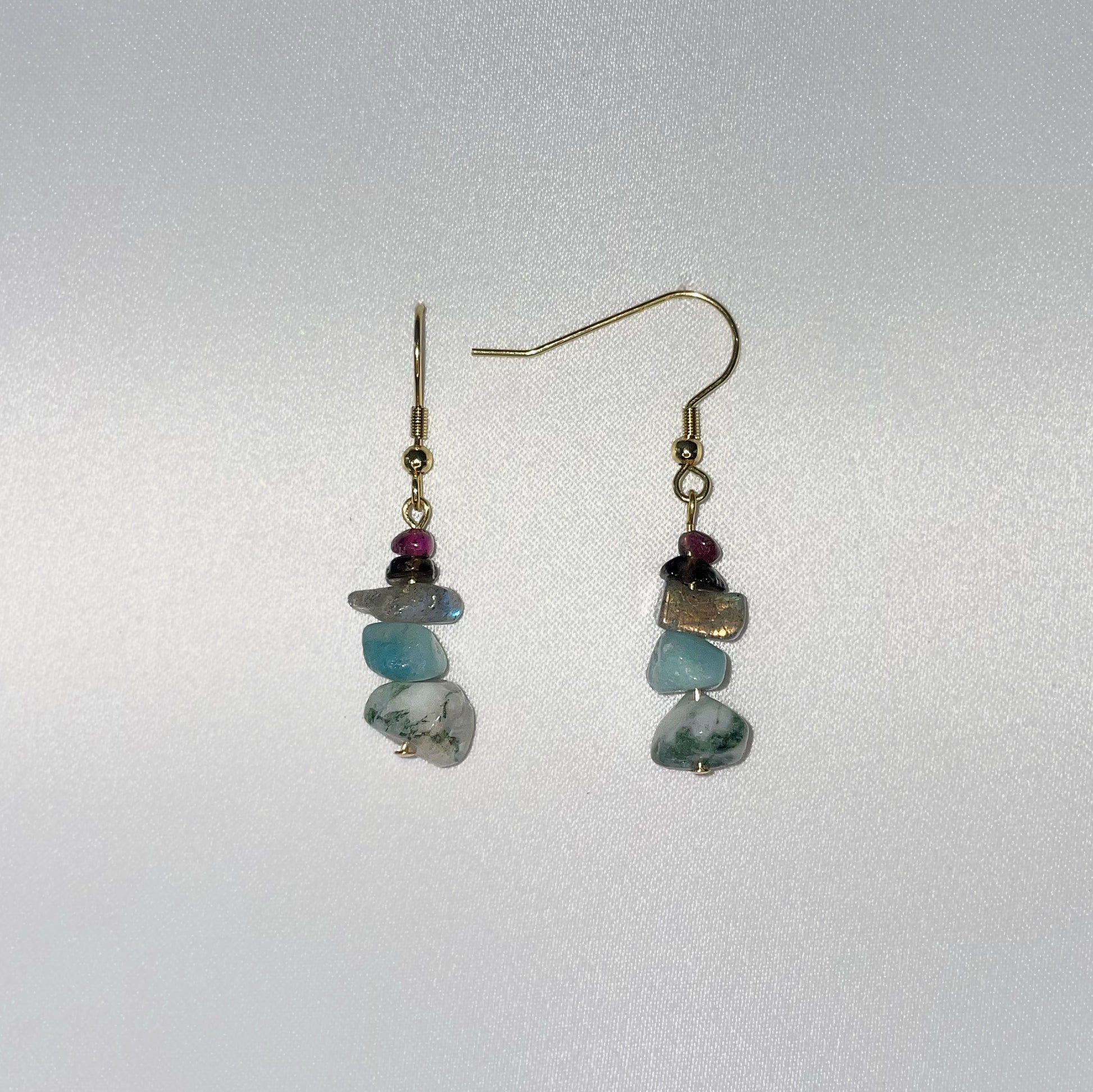 There is something almost magical about these earrings I can't quite put my finger on. Maybe it's the iridescence of the Labradorite or the way the pattern of the Moss Agate almost looks alive. Whatever it is, "Becoming a Better Version of Yourself" is my favorite of the manifestation cairn series. Each natural gemstone is hand picked to insure beautiful and balanced sets. However, beauty is not the only factor in choosing which stones to uses. The crystals that make up this set were selected for their association with metaphysical properties.
